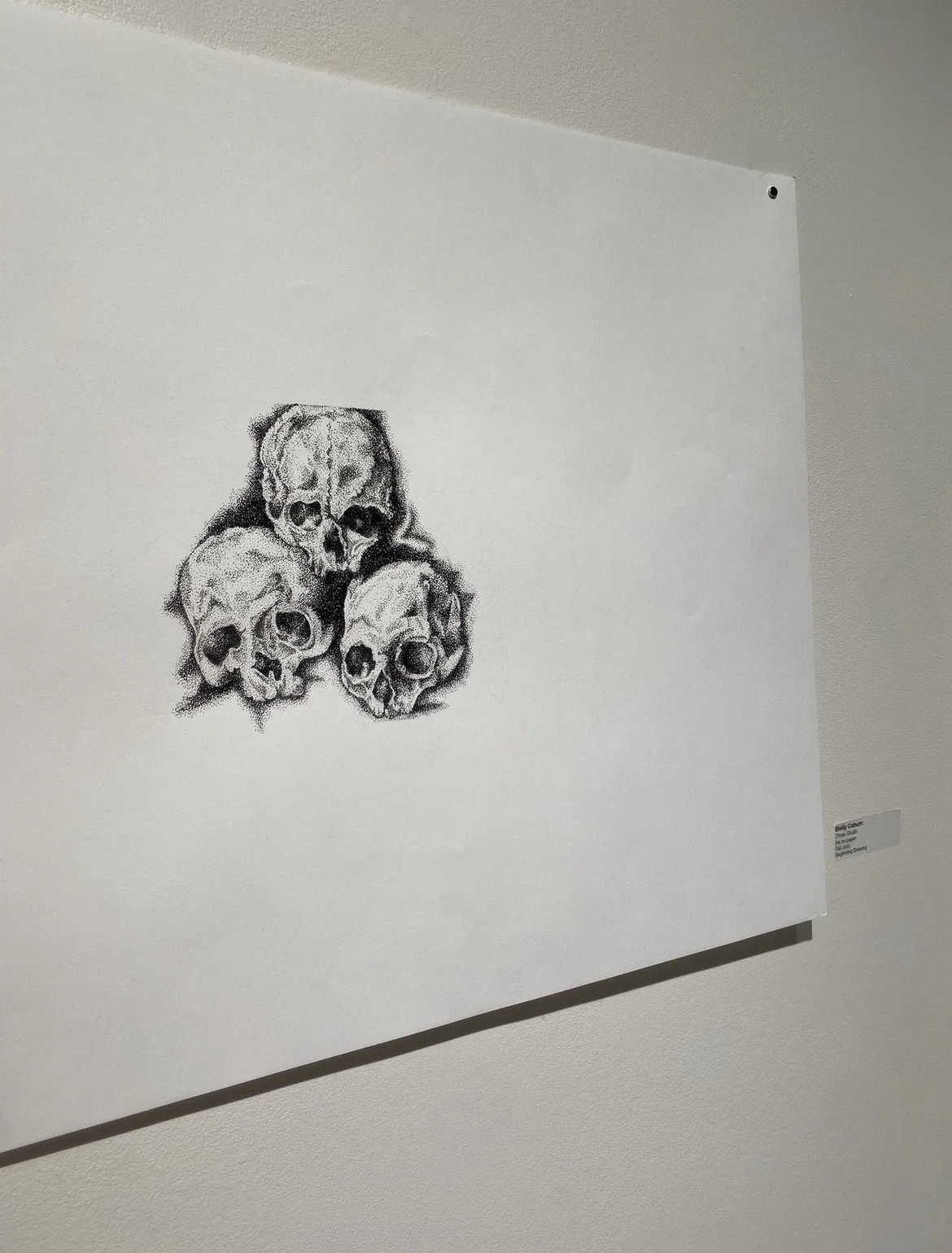 This is a drawing of three skulls inspired by the famous Cézanne painting titled “The Three Skulls.” I practiced using a stippling technique with micron pen. This was displayed at the Samford student juried show in 2024.